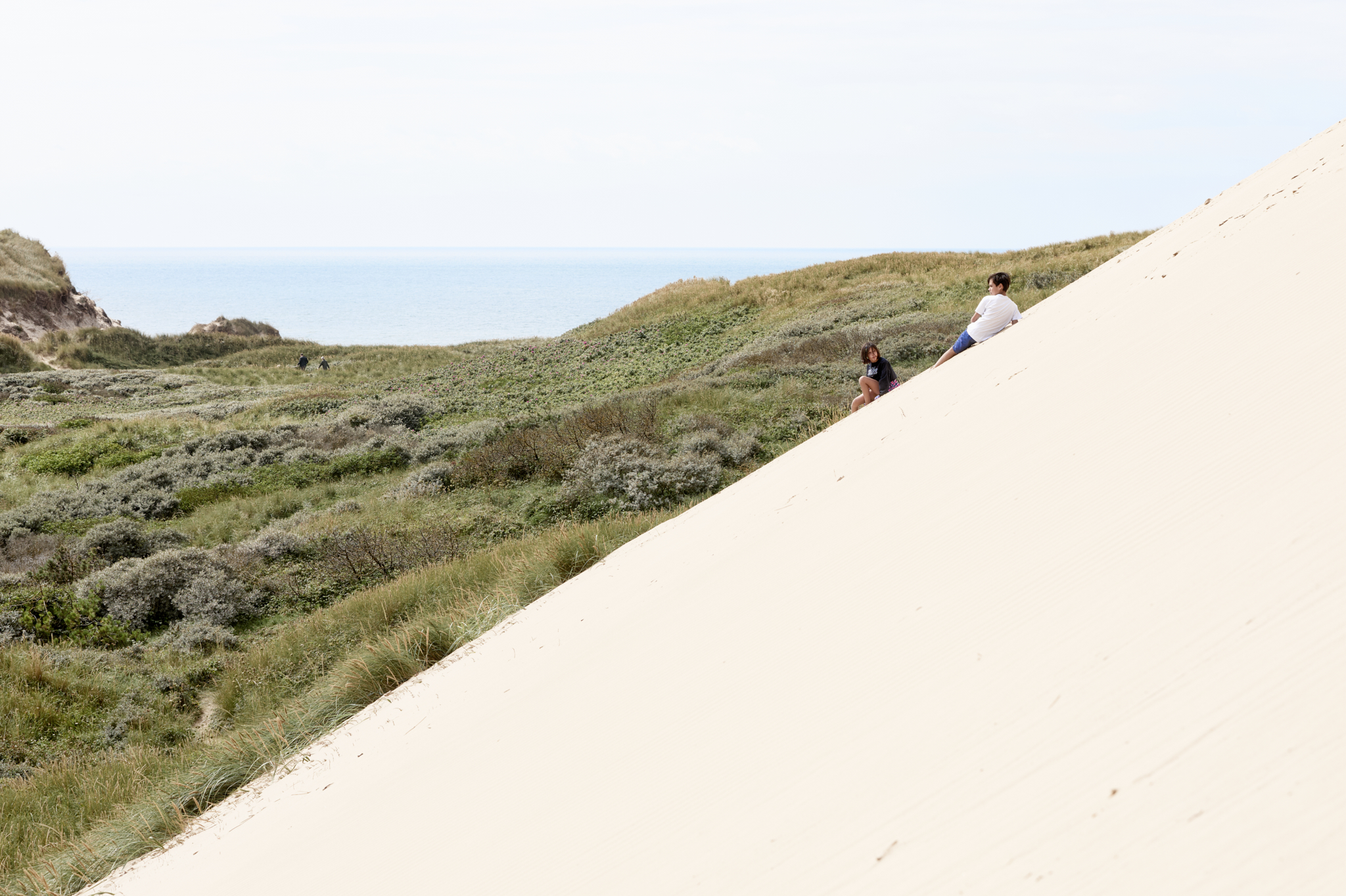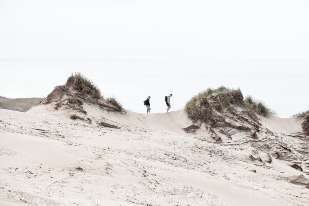 Jeg bevæger mig gennem det blændende hvide sand, der føles levende under fødderne. Klitterne skifter form som langsomme bølger, og hvert skridt ændrer landskabets perspektiv. Fra toppen af klitten er udsigten svimlende: bag mig det grønne, kuperede bagland, foran mig havets uendelighed.