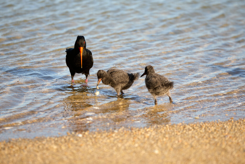 When the tide retreats, oystercatchers, with their distinctive long orange bills, become busy diners along the shoreline. They feed primarily on small shellfish, taking full advantage of the briefly exposed coastal buffet.
